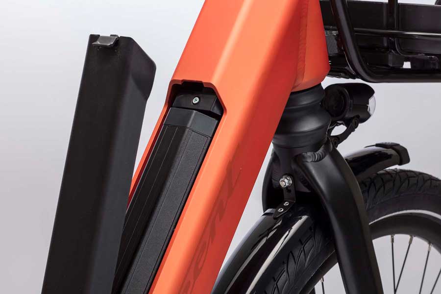 Batteriet på 400 wh är snyggt integrerat i ramen liksom kablage från styret. Det ger en avskalad och ren design och skyddar batteriet. Laddar gör du antingen med batteriet på plats i ramen eller genom att låsa upp och ta ut batteriet.