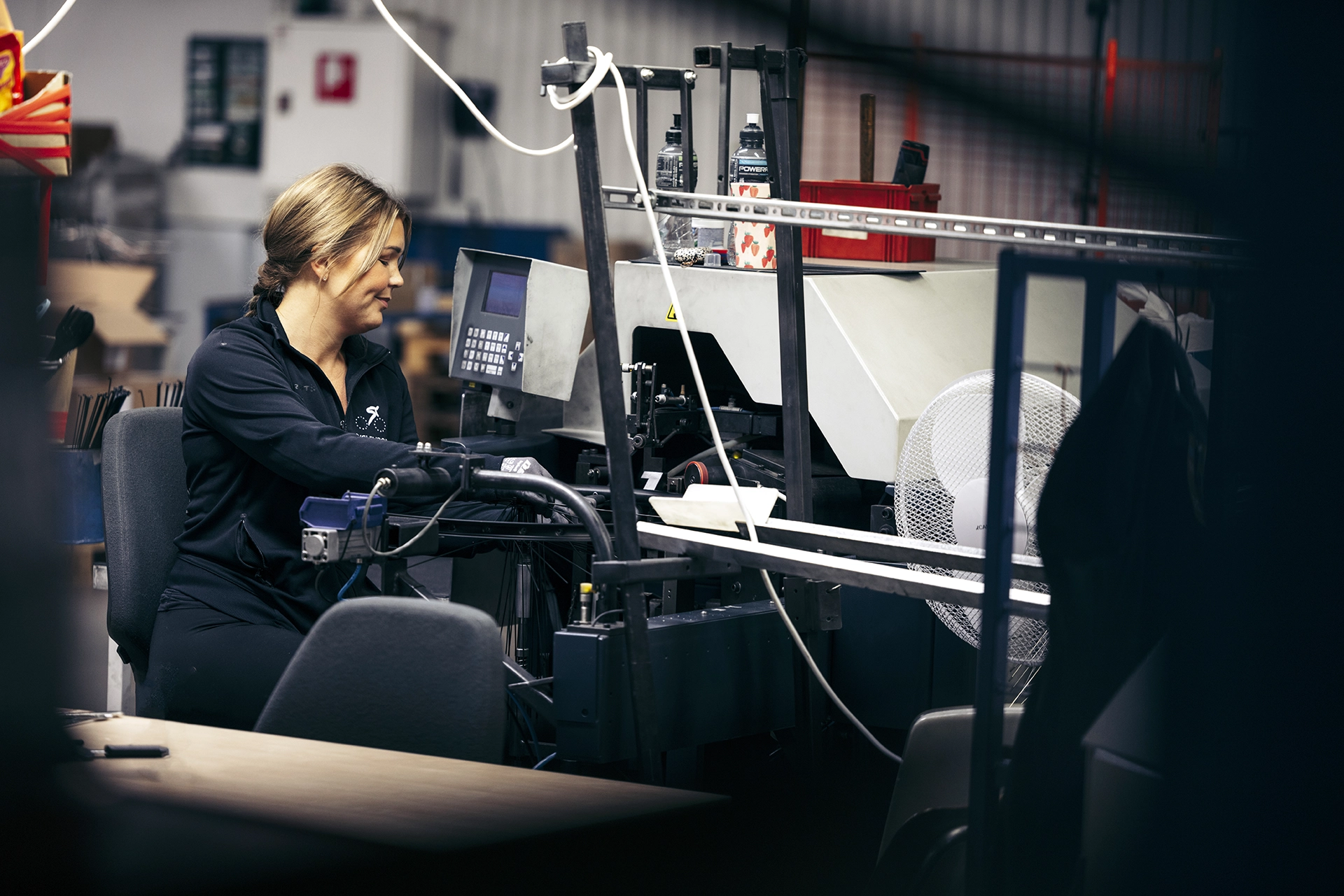 Hjulen börjar ta form när hjulnavet stoppas för hand, eker för eker. Efter att navet fyllts flätar händer ekrarna på plats tillsammans med effektiva maskiner. Elcyklar med framhjulsmotor i hjulet byggs på samma sätt som ett vanligt hjul men då med motorn som central punkt mitt i hjulets hjärta.
